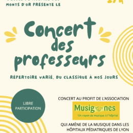 Nous avons le plaisir de vous inviter à l’audition de fin d’année de nos élèves, qui se tiendra le lundi 18 décembre 2023 à la salle des fêtes de Collonges-au-Mont-d’Or. Pour cette évènement, nous organiserons la soirée en deux temps. Programme de la soirée : 18h30 – 19h15 : Représentation des plus jeunes musiciens. 19h30…